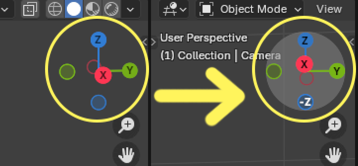 ①のギズモの付近にカーソルを持って行くと、ギズモの周りがグレーになります。そしてカーソルの近くの軸の文字が白くなります。その白くなった軸を基準にして画面が回転します。