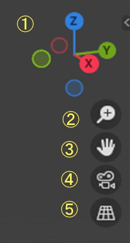 ①のギズモの付近にカーソルを持って行くと、ギズモの周りがグレーになります。そしてカーソルの近くの軸の文字が白くなります。その白くなった軸を基準にして画面が回転します。