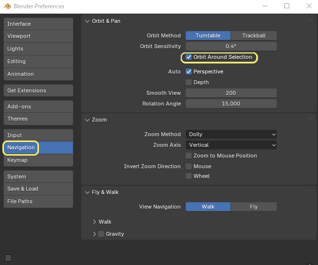 Navigation→Orbit Around Selectionにチェックを入れます。